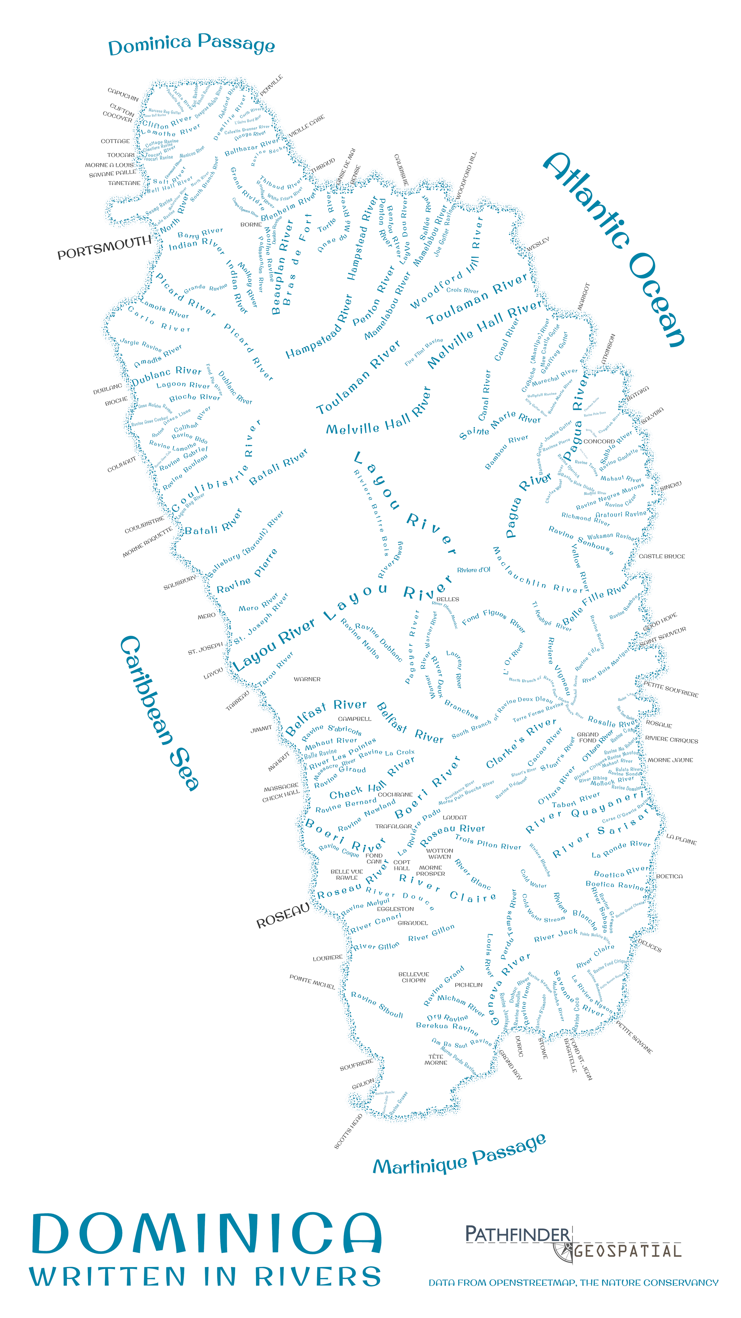 An artistic take on mapping the “Nature Island” of the Caribbean. This map uses only river labels and a simplified coastline to highlight the density and distribution of waterways across Dominica.